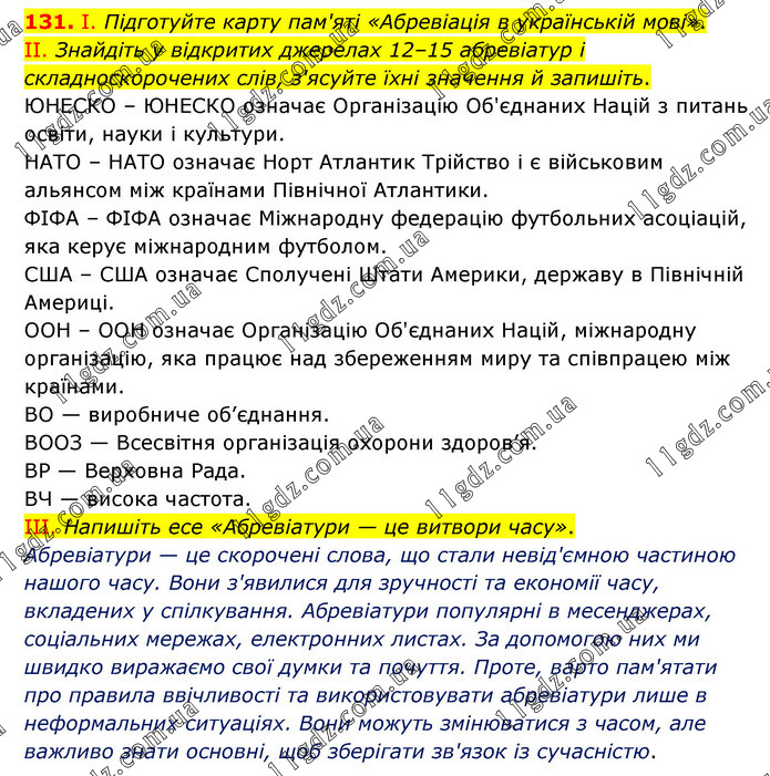 І. Підготуйте карту пам'яті «Абревіація в українській мові». ІІ. Знайдіть у відкритих джерелах 12–15 абревіатур і складноскорочених слів, з'ясуйте їхні значення й запишіть. ЮНЕСКО – ЮНЕСКО означає Організацію Об'єднаних Націй з питань освіти, науки і культури. НАТО – НАТО означає Норт Атлантик Трійство і є військовим альянсом між країнами Північної Атлантики. ФІФА – ФІФА означає Міжнародну федерацію футбольних асоціацій, яка керує міжнародним футболом. США – США означає Сполучені Штати Америки, державу в Північній Америці. ООН – ООН означає Організацію Об'єднаних Націй, міжнародну організацію, яка працює над збереженням миру та співпрацею між країнами. ВО — виробниче об’єднання. ВООЗ — Всесвітня організація охорони здоров’я. ВР — Верховна Рада. ВЧ — висока частота. ІІІ. Напишіть есе «Абревіатури — це витвори часу». Абревіатури — це скорочені слова, що стали невід'ємною частиною нашого часу. Вони з'явилися для зручності та економії часу, вкладених у спілкування. Абревіатури популярні в месенджерах, соціальних мережах, електронних листах. За допомогою них ми швидко виражаємо свої думки та почуття. Проте, варто пам'ятати про правила ввічливості та використовувати абревіатури лише в неформальних ситуаціях. Вони можуть змінюватися з часом, але важливо знати основні, щоб зберігати зв'язок із сучасністю.
