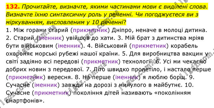Прочитайте, визначте, якими частинами мови є виділені слова. Визначте їхню синтаксичну роль у реченні. Чи погоджуєтеся ви з міркуванням, висловленим у 10 реченні? 1. Між горами старий (прикметник) Дніпро, неначе в молоці дитина. 2. Старий (іменник) увійшов до хати. 3. Мій брат з дитинства мріяв бути військовим (іменник). 4. Військовий (прикметник) корабель охороняє морські рубежі нашої країни. 5. Для виробництва вакцин у світі задіяно всі передові (прикметник) технології. 6. Усі ми чекаємо добрих новин з передової. 7. Літо швидко пролетіло, і настало перше (прикметник) вересня. 8. На перше (іменник) я люблю борщ. 9. Сучасне (іменник) завжди на дорозі з минулого в майбутнє. 10. Сучасне (прикметник) покоління дітей називають «поколінням смартфонів».