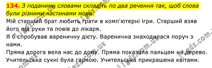 З поданими словами складіть по два речення так, щоб слова були різними частинами мови. Мій старший брат любить грати в комп'ютерні ігри. Старший взяв його під руки та повів до лікаря. Я б спробував вареничну дієту. Варенична знаходилася поруч з нами. Пряма дорога вела нас до дому. Пряма показала пальцем на дерево. Учительська сукні була гарною. Учительська прикрашена квітами.