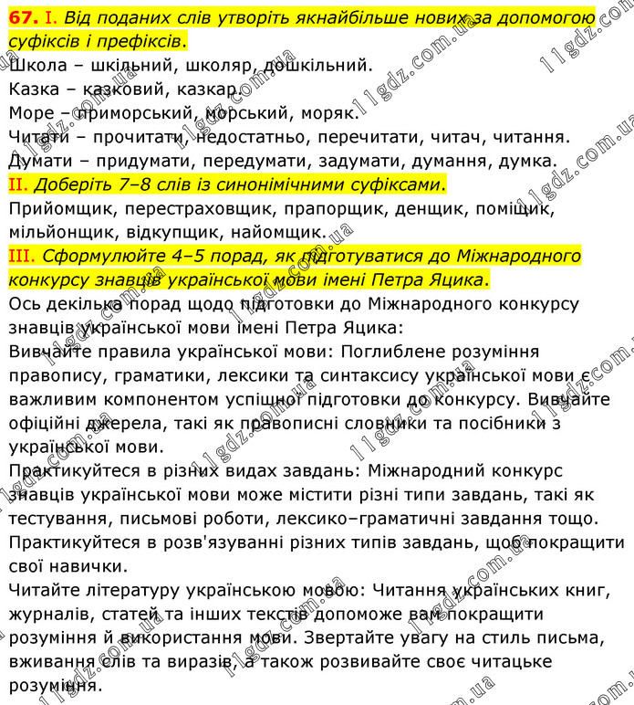 І. Від поданих слів утворіть якнайбільше нових за допомогою суфіксів і префіксів. Школа – шкільний, школяр, дошкільний. Казка – казковий, казкар. Море – приморський, морський, моряк. Читати – прочитати, недостатньо, перечитати, читач, читання. Думати – придумати, передумати, задумати, думання, думка. ІІ. Доберіть 7–8 слів із синонімічними суфіксами. Прийомщик, перестраховщик, прапорщик, денщик, поміщик, мільйонщик, відкупщик, найомщик. ІІІ. Сформулюйте 4–5 порад, як підготуватися до Міжнародного конкурсу знавців української мови імені Петра Яцика. Ось декілька порад щодо підготовки до Міжнародного конкурсу знавців української мови імені Петра Яцика: Вивчайте правила української мови: Поглиблене розуміння правопису, граматики, лексики та синтаксису української мови є важливим компонентом успішної підготовки до конкурсу. Вивчайте офіційні джерела, такі як правописні словники та посібники з української мови. Практикуйтеся в різних видах завдань: Міжнародний конкурс знавців української мови може містити різні типи завдань, такі як тестування, письмові роботи, лексико–граматичні завдання тощо. Практикуйтеся в розв'язуванні різних типів завдань, щоб покращити свої навички. Читайте літературу українською мовою: Читання українських книг, журналів, статей та інших текстів допоможе вам покращити розуміння й використання мови. Звертайте увагу на стиль письма, вживання слів та виразів, а також розвивайте своє читацьке розуміння.