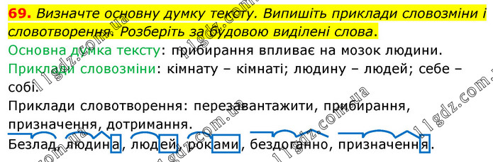 Визначте основну думку тексту. Випишіть приклади словозміни і словотворення. Розберіть за будовою виділені слова. Основна думка тексту: прибирання впливає на мозок людини. Приклади словозміни: кімнату – кімнаті; людину – людей; себе – собі. Приклади словотворення: перезавантажити, прибирання, призначення, дотримання. Безлад, людина, людей, роками, бездоганно, призначення.