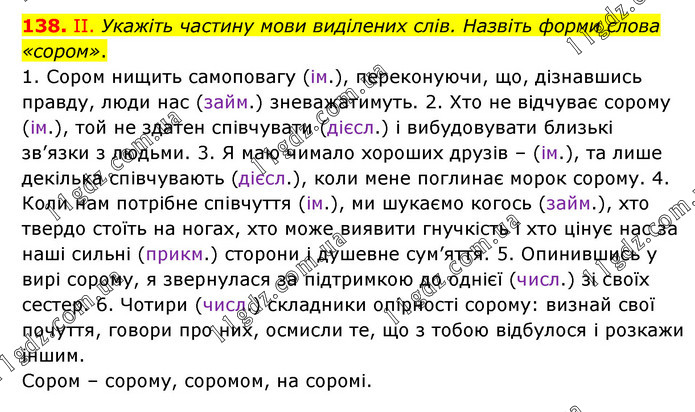 ІІ. Укажіть частину мови виділених слів. Назвіть форми слова «сором». 1. Сором нищить самоповагу (ім.), переконуючи, що, дізнавшись правду, люди нас (займ.) зневажатимуть. 2. Хто не відчуває сорому (ім.), той не здатен співчувати (дієсл.) і вибудовувати близькі зв’язки з людьми. 3. Я маю чимало хороших друзів – (ім.), та лише декілька співчувають (дієсл.), коли мене поглинає морок сорому. 4. Коли нам потрібне співчуття (ім.), ми шукаємо когось (займ.), хто твердо стоїть на ногах, хто може виявити гнучкість і хто цінує нас за наші сильні (прикм.) сторони і душевне сум’яття. 5. Опинившись у вирі сорому, я звернулася за підтримкою до однієї (числ.) зі своїх сестер. 6. Чотири (числ.) складники опірності сорому: визнай свої почуття, говори про них, осмисли те, що з тобою відбулося і розкажи іншим. Сором – сорому, соромом, на соромі.