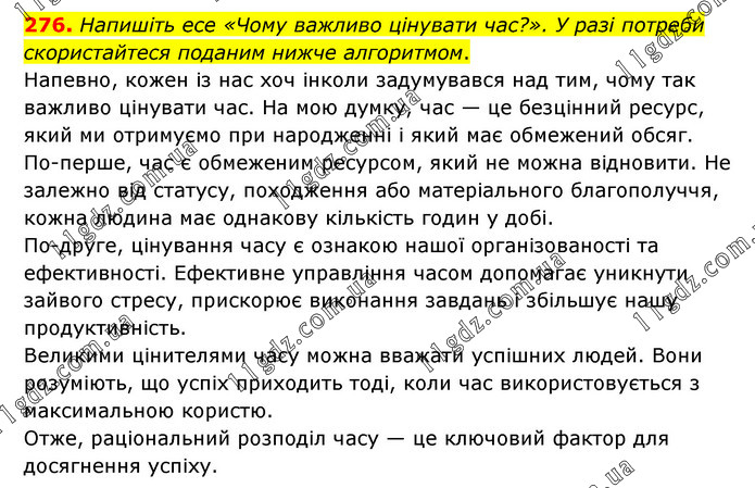 Напишіть есе «Чому важливо цінувати час?». У разі потреби скористайтеся поданим нижче алгоритмом. Напевно, кожен із нас хоч інколи задумувався над тим, чому так важливо цінувати час. На мою думку, час — це безцінний ресурс, який ми отримуємо при народженні і який має обмежений обсяг. По-перше, час є обмеженим ресурсом, який не можна відновити. Не залежно від статусу, походження або матеріального благополуччя, кожна людина має однакову кількість годин у добі. По-друге, цінування часу є ознакою нашої організованості та ефективності. Ефективне управління часом допомагає уникнути зайвого стресу, прискорює виконання завдань і збільшує нашу продуктивність. Великими цінителями часу можна вважати успішних людей. Вони розуміють, що успіх приходить тоді, коли час використовується з максимальною користю. Отже, раціональний розподіл часу — це ключовий фактор для досягнення успіху.