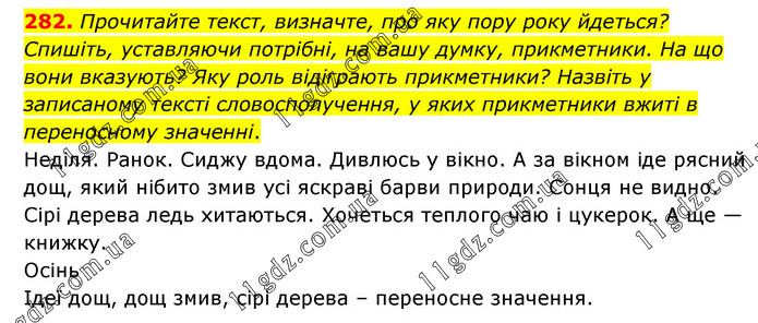 Прочитайте текст, визначте, про яку пору року йдеться? Спишіть, уставляючи потрібні, на вашу думку, прикметники. На що вони вказують? Яку роль відіграють прикметники? Назвіть у записаному тексті словосполучення, у яких прикметники вжиті в переносному значенні. Неділя. Ранок. Сиджу вдома. Дивлюсь у вікно. А за вікном іде рясний дощ, який нібито змив усі яскраві барви природи. Сонця не видно. Сірі дерева ледь хитаються. Хочеться теплого чаю і цукерок. А ще — книжку. Осінь Ідеї дощ, дощ змив, сірі дерева – переносне значення.