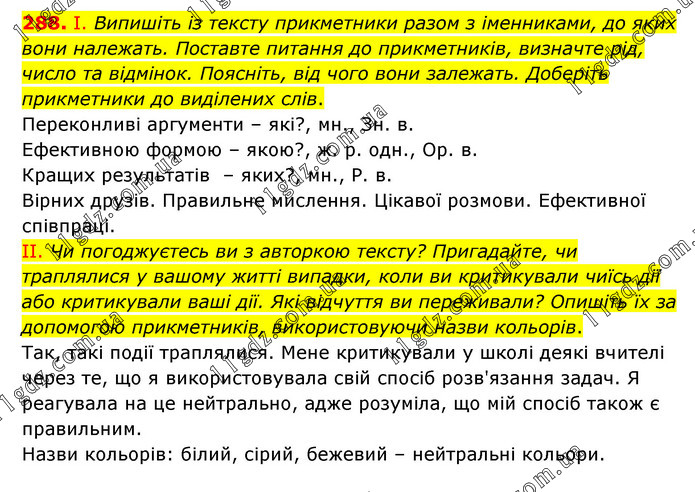 І. Випишіть із тексту прикметники разом з іменниками, до яких вони належать. Поставте питання до прикметників, визначте рід, число та відмінок. Поясніть, від чого вони залежать. Доберіть прикметники до виділених слів. Переконливі аргументи – які?, мн., Зн. в. Ефективною формою – якою?, ж. р. одн., Ор. в. Кращих результатів – яких?, мн., Р. в. Вірних друзів. Правильне мислення. Цікавої розмови. Ефективної співпраці. ІІ. Чи погоджуєтесь ви з авторкою тексту? Пригадайте, чи траплялися у вашому житті випадки, коли ви критикували чиїсь дії або критикували ваші дії. Які відчуття ви переживали? Опишіть їх за допомогою прикметників, використовуючи назви кольорів. Так, такі події траплялися. Мене критикували у школі деякі вчителі через те, що я використовувала свій спосіб розв'язання задач. Я реагувала на це нейтрально, адже розуміла, що мій спосіб також є правильним. Назви кольорів: білий, сірий, бежевий – нейтральні кольори.