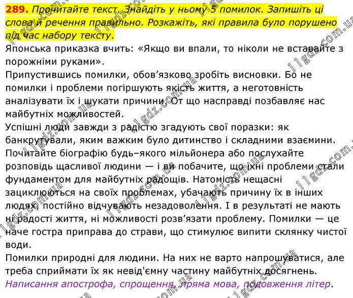 Прочитайте текст. Знайдіть у ньому 5 помилок. Запишіть ці слова й речення правильно. Розкажіть, які правила було порушено під час набору тексту. Японська приказка вчить: «Якщо ви впали, то ніколи не вставайте з порожніми руками». Припустившись помилки, обов’язково зробіть висновки. Бо не помилки і проблеми погіршують якість життя, а неготовність аналізувати їх і шукати причини. От що насправді позбавляє нас майбутніх можливостей. Успішні люди завжди з радістю згадують свої поразки: як банкрутували, яким важким було дитинство і складними взаємини. Почитайте біографію будь–якого мільйонера або послухайте розповідь щасливої людини — і ви побачите, що їхні проблеми стали фундаментом для майбутніх радощів. Натомість нещасні зациклюються на своїх проблемах, убачають причину їх в інших людях, постійно відчувають незадоволення. І в результаті не мають ні радості життя, ні можливості розв’язати проблему. Помилки — це наче гостра приправа до страви, що стимулює випити склянку чистої води. Помилки природні для людини. На них не варто напрошуватися, але треба сприймати їх як невід'ємну частину майбутніх досягнень. Написання апострофа, спрощення, пряма мова, подовження літер.