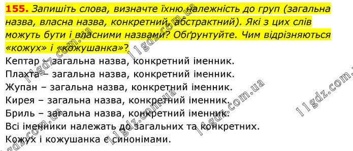 Запишіть слова, визначте їхню належність до груп (загальна назва, власна назва, конкретний, абстрактний). Які з цих слів можуть бути і власними назвами? Обґрунтуйте. Чим відрізняються «кожух» і «кожушанка»? Кептар – загальна назва, конкретний іменник. Плахта – загальна назва, конкретний іменник. Жупан – загальна назва, конкретний іменник. Кирея – загальна назва, конкретний іменник. Бриль – загальна назва, конкретний іменник. Всі іменники належать до загальних та конкретних. Кожух і кожушанка є синонімами.