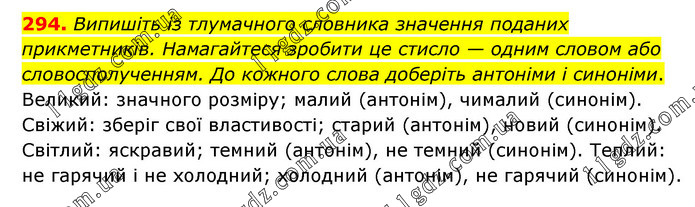 Випишіть із тлумачного словника значення поданих прикметників. Намагайтеся зробити це стисло — одним словом або словосполученням. До кожного слова доберіть антоніми і синоніми. Великий: значного розміру; малий (антонім), чималий (синонім). Свіжий: зберіг свої властивості; старий (антонім), новий (синонім). Світлий: яскравий; темний (антонім), не темний (синонім). Теплий: не гарячий і не холодний; холодний (антонім), не гарячий (синонім).