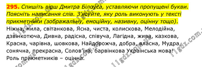 Спишіть вірш Дмитра Білоуса, уставляючи пропущені букви. Поясніть написання слів. З’ясуйте, яку роль виконують у тексті прикметники (зображальну, емоційну, називну, оцінну тощо). Ніжна, мила, світанкова, Ясна, чиста, колискова, Мелодійна, дзвінкотюча, Дивна, радісна, співуча, Лагідна, жива, казкова, Красна, чарівна, шовкова, Найдорожча, добра, власна, Мудра, сонячна, прекрасна, Солов’їна, барвінкова Українська мова! Роль прикметників – оцінна.