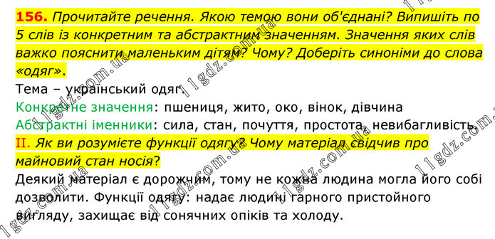 Прочитайте речення. Якою темою вони об'єднані? Випишіть по 5 слів із конкретним та абстрактним значенням. Значення яких слів важко пояснити маленьким дітям? Чому? Доберіть синоніми до слова «одяг». Тема – український одяг. Конкретне значення: пшениця, жито, око, вінок, дівчина Абстрактні іменники: сила, стан, почуття, простота, невибагливість. ІІ. Як ви розумієте функції одягу? Чому матеріал свідчив про майновий стан носія? Деякий матеріал є дорожчим, тому не кожна людина могла його собі дозволити. Функції одягу: надає людині гарного пристойного вигляду, захищає від сонячних опіків та холоду.