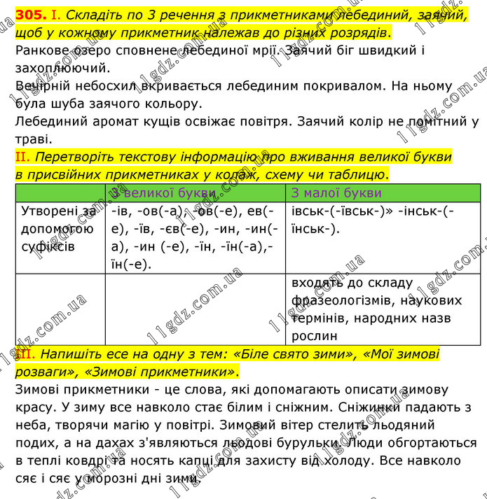 І. Складіть по 3 речення з прикметниками лебединий, заячий, щоб у кожному прикметник належав до різних розрядів. Ранкове озеро сповнене лебединої мрії. Заячий біг швидкий і захоплюючий. Вечірній небосхил вкривається лебединим покривалом. На ньому була шуба заячого кольору. Лебединий аромат кущів освіжає повітря. Заячий колір не помітний у траві. ІІ. Перетворіть текстову інформацію про вживання великої букви в присвійних прикметниках у колаж, схему чи таблицю. ІІІ. Напишіть есе на одну з тем: «Біле свято зими», «Мої зимові розваги», «Зимові прикметники». Зимові прикметники - це слова, які допомагають описати зимову красу. У зиму все навколо стає білим і сніжним. Сніжинки падають з неба, творячи магію у повітрі. Зимовий вітер стелить льодяний подих, а на дахах з'являються льодові бурульки. Люди обгортаються в теплі ковдрі та носять капці для захисту від холоду. Все навколо сяє і сяє у морозні дні зими.