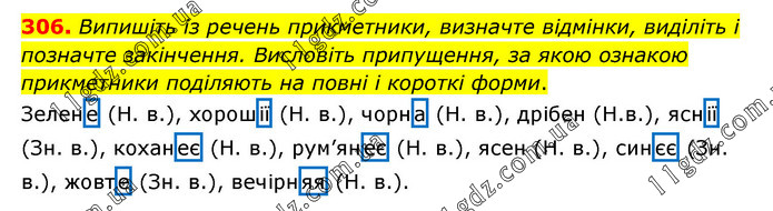 Випишіть із речень прикметники, визначте відмінки, виділіть і позначте закінчення. Висловіть припущення, за якою ознакою прикметники поділяють на повні і короткі форми. Зелене (Н. в.), хорошії (Н. в.), чорна (Н. в.), дрібен (Н.в.), яснії (Зн. в.), коханеє (Н. в.), рум’янеє (Н. в.), ясен (Н. в.), синєє (Зн. в.), жовте (Зн. в.), вечірняя (Н. в.).