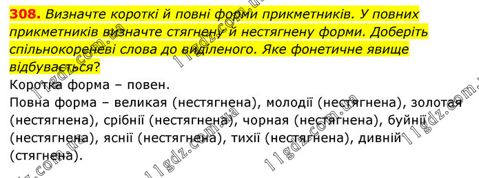 Визначте короткі й повні форми прикметників. У повних прикметників визначте стягнену й нестягнену форми. Доберіть спільнокореневі слова до виділеного. Яке фонетичне явище відбувається? Коротка форма – повен. Повна форма – великая (нестягнена), молодії (нестягнена), золотая (нестягнена), срібнії (нестягнена), чорная (нестягнена), буйнії (нестягнена), яснії (нестягнена), тихії (нестягнена), дивній (стягнена).