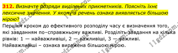 Визначте розряди виділених прикметників. Поясніть їхнє лексичне значення. У якому з речень ознака виявляється більшою мірою? Першим кроком до ефективного розподілу часу є визначення того, які завданням по–справжньому важливі. Розділіть завдання на кілька рівнів: 1 — найважливіші, 2 — важливіші, 3 — важливі. Найважливіші – ознака виражена більшою мірою.