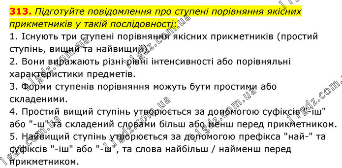 Підготуйте повідомлення про ступені порівняння якісних прикметників у такій послідовності: 1. Існують три ступені порівняння якісних прикметників (простий ступінь, вищий та найвищий). 2. Вони виражають різні рівні інтенсивності або порівняльні характеристики предметів. 3. Форми ступенів порівняння можуть бути простими або складеними. 4. Простий вищий ступінь утворюється за допомогою суфіксів "-іш" або "-ш" та складений словами більш або менш перед прикметником. 5. Найвищий ступінь утворюється за допомогою префікса "най-" та суфіксів "-іш" або "-ш", та слова найбільш / найменш перед прикметником.