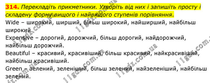 Перекладіть прикметники. Утворіть від них і запишіть просту і складену форму вищого і найвищого ступенів порівняння. Wide – широкий, ширший, більш широкий, найширший, найбільш широкий. Expensive – дорогий, дорожчий, більш дорогий, найдорожчий, найбільш дорожчий. Beautiful – красивий, красивіший, більш красивий, найкрасивіший, найбільш красивіший. Green – зелений, зеленіший, більш зелений, найзеленіший, найбільш зелений.