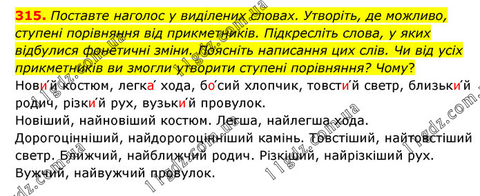 Поставте наголос у виділених словах. Утворіть, де можливо, ступені порівняння від прикметників. Підкресліть слова, у яких відбулися фонетичні зміни. Поясніть написання цих слів. Чи від усіх прикметників ви змогли утворити ступені порівняння? Чому? Нови՛й костюм, легка՛ хода, бо՛сий хлопчик, товсти՛й светр, близьки՛й родич, різки՛й рух, вузьки՛й провулок. Новіший, найновіший костюм. Легша, найлегша хода. Дорогоцінніший, найдорогоцінніший камінь. Товстіший, найтовстіший светр. Ближчий, найближчий родич. Різкіший, найрізкіший рух. Вужчий, найвужчий провулок.