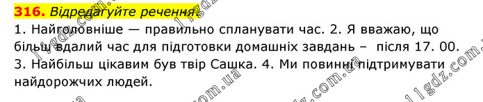 Відредагуйте речення. 1. Найголовніше — правильно спланувати час. 2. Я вважаю, що більш вдалий час для підготовки домашніх завдань – після 17. 00. 3. Найбільш цікавим був твір Сашка. 4. Ми повинні підтримувати найдорожчих людей.