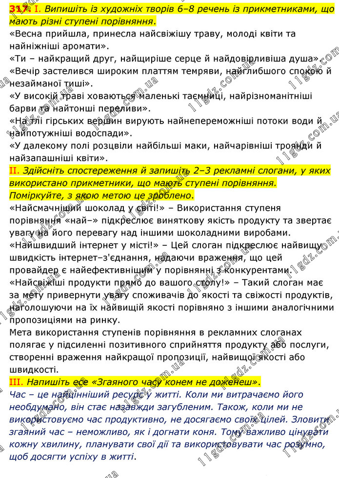І. Випишіть із художніх творів 6–8 речень із прикметниками, що мають різні ступені порівняння. «Весна прийшла, принесла найсвіжішу траву, молоді квіти та найніжніші аромати». «Ти – найкращий друг, найщиріше серце й найдовірливіша душа». «Вечір застелився широким платтям темряви, найглибшого спокою й незайманої тиші». «У високій траві ховаються маленькі таємниці, найрізноманітніші барви та найтонші переливи». «На тлі гірських вершин вирують найнепереможніші потоки води й найпотужніші водоспади». «У далекому полі розцвіли найбільші маки, найчарівніші троянди й найзапашніші квіти». ІІ. Здійсніть спостереження й запишіть 2–3 рекламні слогани, у яких використано прикметники, що мають ступені порівняння. Поміркуйте, з якою метою це зроблено. «Найсмачніший шоколад у світі!» – Використання ступеня порівняння «най–» підкреслює виняткову якість продукту та звертає увагу на його перевагу над іншими шоколадними виробами. «Найшвидший інтернет у місті!» – Цей слоган підкреслює найвищу швидкість інтернет–з'єднання, надаючи враження, що цей провайдер є найефективнішим у порівнянні з конкурентами. «Найсвіжіші продукти прямо до вашого столу!» – Такий слоган має за мету привернути увагу споживачів до якості та свіжості продуктів, наголошуючи на їх найвищій якості порівняно з іншими аналогічними пропозиціями на ринку. Мета використання ступенів порівняння в рекламних слоганах полягає у підсиленні позитивного сприйняття продукту або послуги, створенні враження найкращої пропозиції, найвищої якості або швидкості. ІІІ. Напишіть есе «Згаяного часу конем не доженеш». Час – це найцінніший ресурс у житті. Коли ми витрачаємо його необдумано, він стає назавжди загубленим. Також, коли ми не використовуємо час продуктивно, не досягаємо своїх цілей. Зловити згаяний час – неможливо, як і догнати коня. Тому важливо цінувати кожну хвилину, планувати свої дії та використовувати час розумно, щоб досягти успіху в житті.