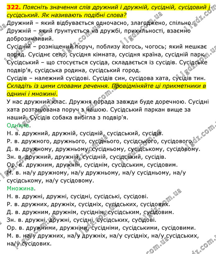 Поясніть значення слів дружний і дружній, сусідній, сусідовий і сусідський. Як називають подібні слова? Дружний – який відбувається одночасно, злагоджено, спільно. Дружній – який ґрунтується на дружбі, прихильності, взаємно доброзичливий. Сусідній – розміщений поруч, поблизу когось, чогось; який мешкає поряд. Сусіднє село, сусідня кімната, сусідня країна, сусідній парк. Сусідський – що стосується сусіда, складається із сусідів. Сусідське подвір’я, сусідська родина, сусідський город. Сусідів – належний сусідові. Сусідів син, сусідова хата, сусідів тин. Складіть із цими словами речення. Провідміняйте ці прикметники в однині і множині. У нас дружний клас. Дружня порада завжди буде доречною. Сусідні хата розташована поруч з нашою. Сусідський паркан вище за наший. Сусідів собака вибігла з подвір'я. Однина. Н. в. дружний, дружній, сусідній, сусідський, сусідів. Р. в. дружного, дружнього, сусіднього, сусідського, сусідового. Д. в. дружному, дружньому, сусідньому, сусідському, сусідовому. Зн. в. дружний, дружній, сусідній, сусідський, сусідів. Ор. в. дружним, дружнім, сусіднім, сусідським, сусідовим. М. в. на/у дружному, на/у дружньому, на/у сусідньому, на/у сусідському, на/у сусідовому. Множина. Н. в. дружні, дружні, сусідні, сусідські, сусідові. Р. в. дружних, дружніх, сусідніх, сусідських, сусідових. Д. в. дружним, дружнім, сусіднім, сусідським, сусідовим. Зн. в. дружні, дружні, сусідні, сусідських, сусідові. Ор. в. дружними, дружніми, сусідніми, сусідськими, сусідовими. М. в. на/у дружних, на/у дружніх, на/у сусідніх, на/у сусідських, на/у сусідових.
