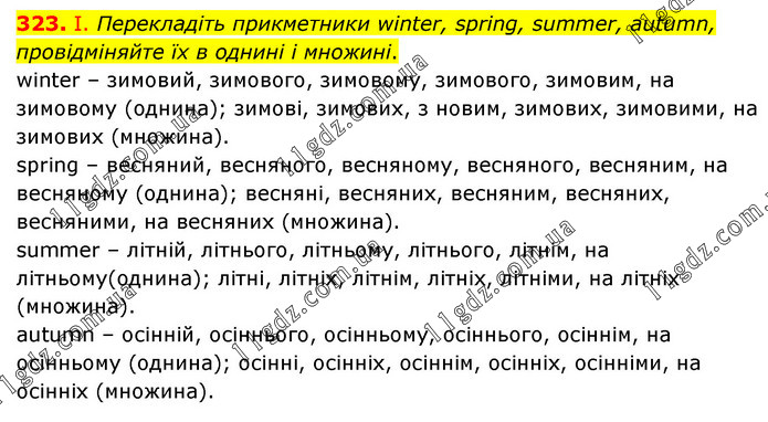 І. Перекладіть прикметники winter, spring, summer, autumn, провідміняйте їх в однині і множині. winter – зимовий, зимового, зимовому, зимового, зимовим, на зимовому (однинa); зимові, зимових, з новим, зимових, зимовими, на зимових (множина). spring – весняний, весняного, весняному, весняного, весняним, на весняному (однинa); весняні, весняних, весняним, весняних, весняними, на весняних (множина). summer – літній, літнього, літньому, літнього, літнім, на літньому(однинa); літні, літніх, літнім, літніх, літніми, на літніх (множина). autumn – осінній, осіннього, осінньому, осіннього, осіннім, на осінньому (однинa); осінні, осінніх, осіннім, осінніх, осінніми, на осінніх (множина).
