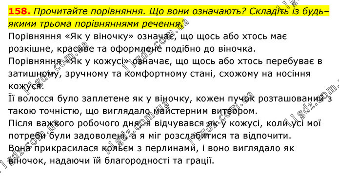 Прочитайте порівняння. Що вони означають? Складіть із будь– якими трьома порівняннями речення. Порівняння «Як у віночку» означає, що щось або хтось має розкішне, красиве та оформлене подібно до віночка. Порівняння «Як у кожусі» означає, що щось або хтось перебуває в затишному, зручному та комфортному стані, схожому на носіння кожуся. Її волосся було заплетене як у віночку, кожен пучок розташований з такою точністю, що виглядало майстерним витвором. Після важкого робочого дня, я відчувався як у кожусі, коли усі мої потреби були задоволені, а я міг розслабитися та відпочити. Вона прикрасилася кольєм з перлинами, і воно виглядало як віночок, надаючи їй благородності та грації.