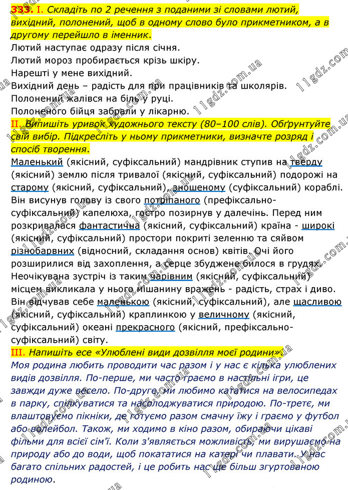 І. Складіть по 2 речення з поданими зі словами лютий, вихідний, полонений, щоб в одному слово було прикметником, а в другому перейшло в іменник. Лютий наступає одразу після січня. Лютий мороз пробирається крізь шкіру. Нарешті у мене вихідний. Вихідний день – радість для при працівників та школярів. Полонений жалівся на біль у руці. Полоненого бійця забрали у лікарню. ІІ. Випишіть уривок художнього тексту (80–100 слів). Обґрунтуйте свій вибір. Підкресліть у ньому прикметники, визначте розряд і спосіб творення. Маленький (якісний, суфіксальний) мандрівник ступив на тверду (якісний) землю після тривалої (якісний, суфіксальний) подорожі на старому (якісний, суфіксальний), зношеному (суфіксальний) кораблі. Він висунув голову із свого потріпаного (префіксально-суфіксальний) капелюха, гостро позирнув у далечінь. Перед ним розкривалася фантастична (якісний, суфіксальний) країна - широкі (якісний, суфіксальний) простори покриті зеленню та сяйвом різнобарвних (відносний, складання основ) квітів. Очі його розширилися від захоплення, а серце збуджене билося в грудях. Неочікувана зустріч із таким чарівним (якісний, суфіксальний) місцем викликала у нього мішанину вражень - радість, страх і диво. Він відчував себе маленькою (якісний, суфіксальний), але щасливою (якісний, суфіксальний) краплинкою у величному (якісний, суфіксальний) океані прекрасного (якісний, префіксально-суфіксальний) світу. ІІІ. Напишіть есе «Улюблені види дозвілля моєї родини». Моя родина любить проводити час разом і у нас є кілька улюблених видів дозвілля. По-перше, ми часто граємо в настільні ігри, це завжди дуже весело. По-друге, ми любимо кататися на велосипедах в парку, спілкуватися та насолоджуватися природою. По-третє, ми влаштовуємо пікніки, де готуємо разом смачну їжу і граємо у футбол або волейбол. Також, ми ходимо в кіно разом, обираючи цікаві фільми для всієї сім'ї. Коли з'являється можливість, ми вирушаємо на природу або до води, щоб покататися на катері чи плавати. У нас багато спільних радостей, і це робить нас ще більш згуртованою родиною.