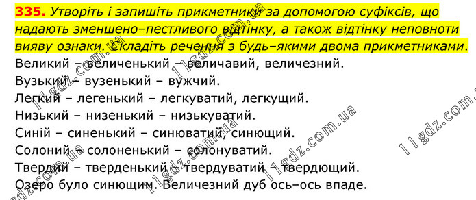 Утворіть і запишіть прикметники за допомогою суфіксів, що надають зменшено–пестливого відтінку, а також відтінку неповноти вияву ознаки. Складіть речення з будь–якими двома прикметниками. Великий – величенький – величавий, величезний. Вузький – вузенький – вужчий. Легкий – легенький – легкуватий, легкущий. Низький – низенький – низькуватий. Синій – синенький – синюватий, синющий. Солоний – солоненький – солонуватий. Твердий – тверденький – твердуватий – твердющий. Озеро було синющим. Величезний дуб ось–ось впаде.