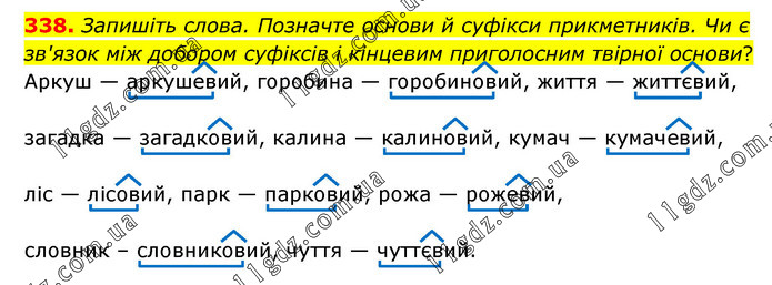 Запишіть слова. Позначте основи й суфікси прикметників. Чи є зв'язок між добором суфіксів і кінцевим приголосним твірної основи? Аркуш — аркушевий, горобина — горобиновий, життя — життєвий, загадка — загадковий, калина — калиновий, кумач — кумачевий, ліс — лісовий, парк — парковий, рожа — рожевий, словник – словниковий, чуття — чуттєвий.