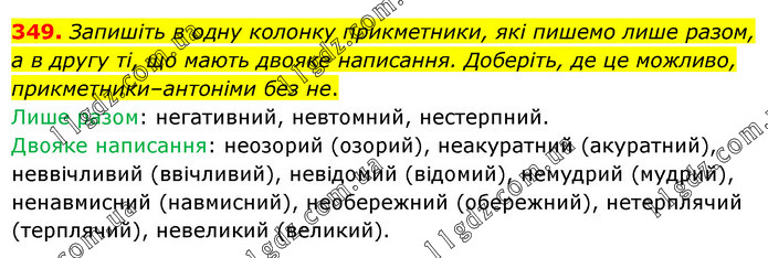 Запишіть в одну колонку прикметники, які пишемо лише разом, а в другу ті, що мають двояке написання. Доберіть, де це можливо, прикметники–антоніми без не. Лише разом: негативний, невтомний, нестерпний. Двояке написання: неозорий (озорий), неакуратний (акуратний), неввічливий (ввічливий), невідомий (відомий), немудрий (мудрий), ненавмисний (навмисний), необережний (обережний), нетерплячий (терплячий), невеликий (великий).