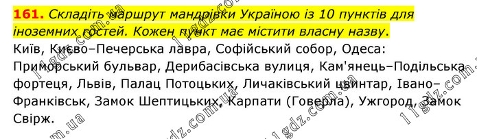 Складіть маршрут мандрівки Україною із 10 пунктів для іноземних гостей. Кожен пункт має містити власну назву. Київ, Києво–Печерська лавра, Софійський собор, Одеса: Приморський бульвар, Дерибасівська вулиця, Кам'янець–Подільська фортеця, Львів, Палац Потоцьких, Личаківський цвинтар, Івано–Франківськ, Замок Шептицьких, Карпати (Говерла), Ужгород, Замок Свірж.