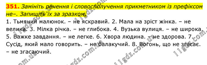 Замініть речення і словосполучення прикметником із префіксом не–. Запишіть їх за зразком. 1. Тьмяний малюнок. – не яскравий. 2. Мала на зріст жінка. – не велика. 3. Мілка річка. – не глибока. 4. Вузька вулиця. – не широка. 5. Важке завдання. – не легке. 6. Хвора людина. – не здорова. 7. Сусід, який мало говорить. – не балакучий. 8. Вогонь, що не згасає. – не згасаючий.