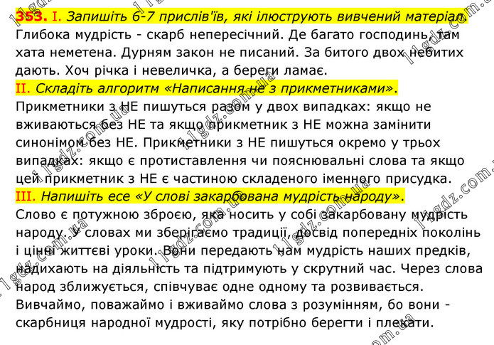 І. Запишіть 6-7 прислів'їв, які ілюструють вивчений матеріал. Глибока мудрість - скарб непересічний. Де багато господинь, там хата неметена. Дурням закон не писаний. За битого двох небитих дають. Хоч річка і невеличка, а береги ламає. ІІ. Складіть алгоритм «Написання не з прикметниками». Прикметники з НЕ пишуться разом у двох випадках: якщо не вживаються без НЕ та якщо прикметник з НЕ можна замінити синонімом без НЕ. Прикметники з НЕ пишуться окремо у трьох випадках: якщо є протиставлення чи пояснювальні слова та якщо цей прикметник з НЕ є частиною складеного іменного присудка. ІІІ. Напишіть есе «У слові закарбована мудрість народу». Слово є потужною зброєю, яка носить у собі закарбовану мудрість народу. У словах ми зберігаємо традиції, досвід попередніх поколінь і цінні життєві уроки. Вони передають нам мудрість наших предків, надихають на діяльність та підтримують у скрутний час. Через слова народ зближується, співчуває одне одному та розвивається. Вивчаймо, поважаймо і вживаймо слова з розумінням, бо вони - скарбниця народної мудрості, яку потрібно берегти і плекати.