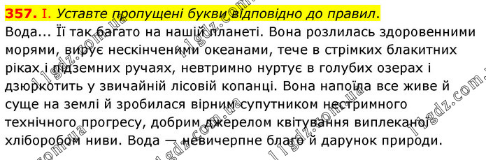 І. Уставте пропущені букви відповідно до правил. Вода... Її так багато на нашій планеті. Вона розлилась здоровенними морями, вирує нескінченими океанами, тече в стрімких блакитних ріках і підземних ручаях, невтримно нуртує в голубих озерах і дзюркотить у звичайній лісовій копанці. Вона напоїла все живе й суще на землі й зробилася вірним супутником нестримного технічного прогресу, добрим джерелом квітування виплеканої хліборобом ниви. Вода — невичерпне благо й дарунок природи.