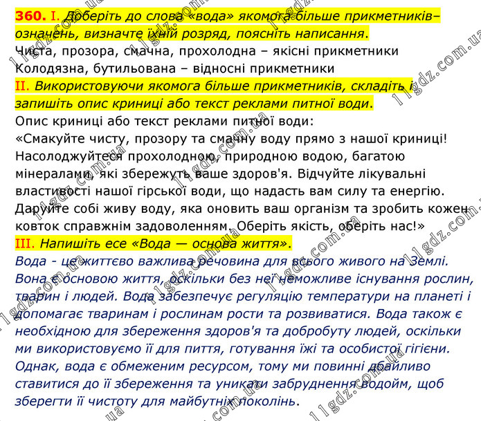 І. Доберіть до слова «вода» якомога більше прикметників–означень, визначте їхній розряд, поясніть написання. Чиста, прозора, смачна, прохолодна – якісні прикметники Колодязна, бутильована – відносні прикметники ІІ. Використовуючи якомога більше прикметників, складіть і запишіть опис криниці або текст реклами питної води. Опис криниці або текст реклами питної води: «Смакуйте чисту, прозору та смачну воду прямо з нашої криниці! Насолоджуйтеся прохолодною, природною водою, багатою мінералами, які збережуть ваше здоров'я. Відчуйте лікувальні властивості нашої гірської води, що надасть вам силу та енергію. Даруйте собі живу воду, яка оновить ваш організм та зробить кожен ковток справжнім задоволенням. Оберіть якість, оберіть нас!» ІІІ. Напишіть есе «Вода — основа життя». Вода - це життєво важлива речовина для всього живого на Землі. Вона є основою життя, оскільки без неї неможливе існування рослин, тварин і людей. Вода забезпечує регуляцію температури на планеті і допомагає тваринам і рослинам рости та розвиватися. Вода також є необхідною для збереження здоров'я та добробуту людей, оскільки ми використовуємо її для пиття, готування їжі та особистої гігієни. Однак, вода є обмеженим ресурсом, тому ми повинні дбайливо ставитися до її збереження та уникати забруднення водойм, щоб зберегти її чистоту для майбутніх поколінь.