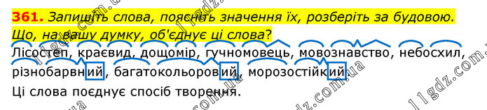 Запишіть слова, поясніть значення їх, розберіть за будовою. Що, на вашу думку, об'єднує ці слова? Лісостеп, краєвид, дощомір, гучномовець, мовознавство, небосхил, різнобарвний, багатокольоровий, морозостійкий. Ці слова поєднує спосіб творення.