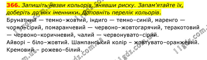 Запишіть назви кольорів, знявши риску. Запам'ятайте їх, доберіть до них іменники. Доповніть перелік кольорів. Брунатний — темно–жовтий, індиго — темно–синій, маренго — чорно–сірий, помаранчевий — червоно–жовтогарячий, теракотовий — червоно–коричневий, чалий — червонувато–сірий. Айворі – біло–жовтий. Шампанський колір – жовтувато–оранжевий. Кремовий – рожево–білий.
