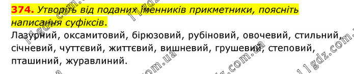 Утворіть від поданих іменників прикметники, поясніть написання суфіксів. Лазурний, оксамитовий, бірюзовий, рубіновий, овочевий, стильний, січневий, чуттєвий, життєвий, вишневий, грушевий, степовий, пташиний, журавлиний.