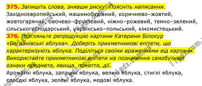 375. Запишіть слова, знявши риску. Поясніть написання. Західноєвропейський, машинобудівний, коричнево–жовтий, жовтогарячий, овочево–фруктовий, ніжно–рожевий, темно–зелений, сільськогосподарський, українсько–польський, кіномистецький. 376. Розгляньте репродукцію картини Катерини Білокур «Богданівські яблука». Доберіть прикметникові епітети, що характеризують яблука. Поділіться своїми враженнями від картини. Використайте прикметникові епітети на позначення самобутньої ознаки предмета, явища, поняття, дії. Ароматні яблука, запашні яблука, великі яблука, стиглі яблука, солодкі яблука, зелені яблука, медові яблука.