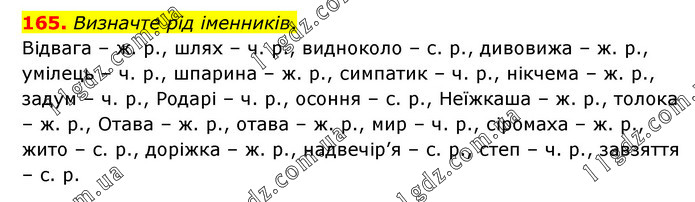 Визначте рід іменників. Відвага – ж. р., шлях – ч. р., видноколо – с. р., дивовижа – ж. р., умілець – ч. р., шпарина – ж. р., симпатик – ч. р., нікчема – ж. р., задум – ч. р., Родарі – ч. р., осоння – с. р., Неїжкаша – ж. р., толока – ж. р., Отава – ж. р., отава – ж. р., мир – ч. р., сіромаха – ж. р., жито – с. р., доріжка – ж. р., надвечір’я – с. р., степ – ч. р., завзяття – с. р.