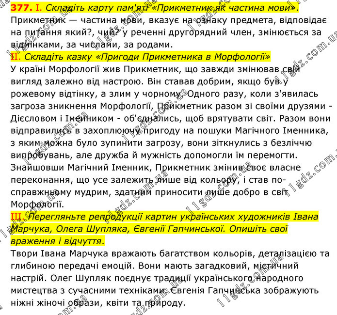 І. Складіть карту пам'яті «Прикметник як частина мови». Прикметник — частина мови, вказує на ознаку предмета, відповідає на питання який?, чий? у реченні другорядний член, змінюється за відмінками, за числами, за родами. ІІ. Складіть казку «Пригоди Прикметника в Морфології» У країні Морфології жив Прикметник, що завжди змінював свій вигляд залежно від настрою. Він ставав добрим, якщо був у рожевому відтінку, а злим у чорному. Одного разу, коли з'явилась загроза зникнення Морфології, Прикметник разом зі своїми друзями - Дієсловом і Іменником - об'єднались, щоб врятувати світ. Разом вони відправились в захоплюючу пригоду на пошуки Магічного Іменника, з яким можна було зупинити загрозу, вони зіткнулись з безліччю випробувань, але дружба й мужність допомогли їм перемогти. Знайшовши Магічний Іменник, Прикметник змінив своє власне переконання, що усе залежить лише від кольору, і став по-справжньому мудрим, здатним приносити лише добро в світ Морфології. ІІІ. Перегляньте репродукції картин українських художників Івана Марчука, Олега Шупляка, Євгенії Гапчинської. Опишіть свої враження і відчуття. Твори Івана Марчука вражають багатством кольорів, деталізацією та глибиною передачі емоцій. Вони мають загадковий, містичний настрій. Олег Шупляк поєднує традиції українського народного мистецтва з сучасними техніками. Євгенія Гапчинська зображують ніжні жіночі образи, квіти та природу.