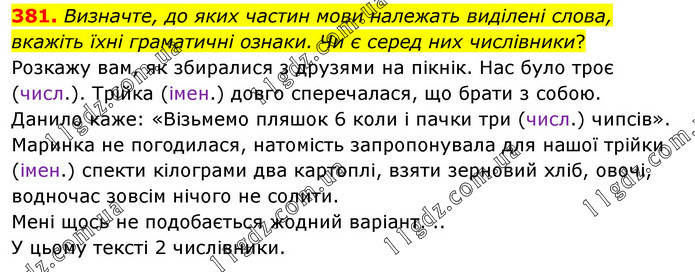 Визначте, до яких частин мови належать виділені слова, вкажіть їхні граматичні ознаки. Чи є серед них числівники? Розкажу вам, як збиралися з друзями на пікнік. Нас було троє (числ.). Трійка (імен.) довго сперечалася, що брати з собою. Данило каже: «Візьмемо пляшок 6 коли і пачки три (числ.) чипсів». Маринка не погодилася, натомість запропонувала для нашої трійки (імен.) спекти кілограми два картоплі, взяти зерновий хліб, овочі, водночас зовсім нічого не солити. Мені щось не подобається жодний варіант. .. У цьому тексті 2 числівники.