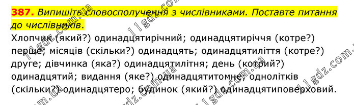 Випишіть словосполучення з числівниками. Поставте питання до числівників. Хлопчик (який?) одинадцятирічний; одинадцятиріччя (котре?) перше; місяців (скільки?) одинадцять; одинадцятиліття (котре?) друге; дівчинка (яка?) одинадцятилітня; день (котрий?) одинадцятий; видання (яке?) одинадцятитомне; однолітків (скільки?) одинадцятеро; будинок (який?) одинадцятиповерховий.
