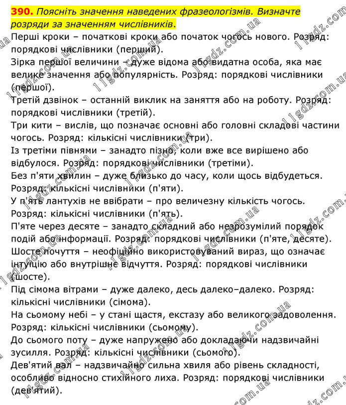 Поясніть значення наведених фразеологізмів. Визначте розряди за значенням числівників. Перші кроки – початкові кроки або початок чогось нового. Розряд: порядкові числівники (перший). Зірка першої величини – дуже відома або видатна особа, яка має велике значення або популярність. Розряд: порядкові числівники (першої). Третій дзвінок – останній виклик на заняття або на роботу. Розряд: порядкові числівники (третій). Три кити – вислів, що позначає основні або головні складові частини чогось. Розряд: кількісні числівники (три). Із третіми півнями – занадто пізно, коли вже все вирішено або відбулося. Розряд: порядкові числівники (третіми). Без п'яти хвилин – дуже близько до часу, коли щось відбудеться. Розряд: кількісні числівники (п'яти). У п'ять лантухів не ввібрати – про величезну кількість чогось. Розряд: кількісні числівники (п'ять). П'яте через десяте – занадто складний або незрозумілий порядок подій або інформації. Розряд: порядкові числівники (п'яте, десяте). Шосте почуття – неофіційно використовуваний вираз, що означає інтуїцію або внутрішнє відчуття. Розряд: порядкові числівники (шосте). Під сімома вітрами – дуже далеко, десь далеко–далеко. Розряд: кількісні числівники (сімома). На сьомому небі – у стані щастя, екстазу або великого задоволення. Розряд: кількісні числівники (сьомому). До сьомого поту – дуже напружено або докладаючи надзвичайні зусилля. Розряд: кількісні числівники (сьомого). Дев'ятий вал – надзвичайно сильна хвиля або рівень складності, особливо відносно стихійного лиха. Розряд: порядкові числівники (дев'ятий).