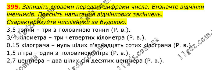 Запишіть словами передані цифрами числа. Визначте відмінки іменників. Поясніть написання відмінкових закінчень. Схарактеризуйте числівники за будовою. 3,5 тонни – три з половиною тонни (Р. в.). 3/4 кілометра – три четвертих кілометра (Р. в.). 0,15 кілограма – нуль цілих п'ятнадцять сотих кілограма (Р. в.). 1,5 літра – один з половиною літра (Р. в.). 2,7 центнера – два цілих сім десятих центнера (Р. в.).