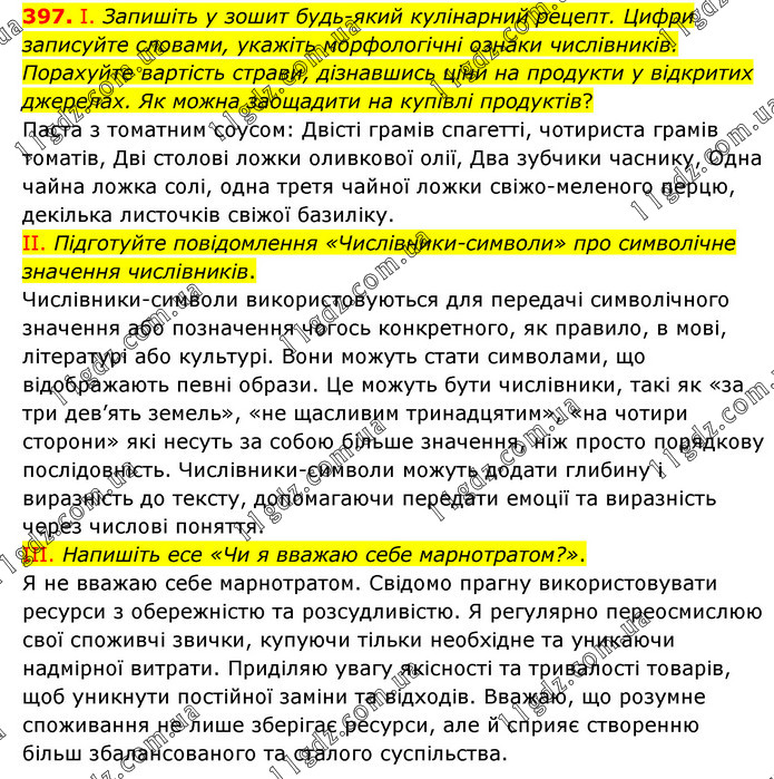 І. Запишіть у зошит будь-який кулінарний рецепт. Цифри записуйте словами, укажіть морфологічні ознаки числівників. Порахуйте вартість страви, дізнавшись ціни на продукти у відкритих джерелах. Як можна заощадити на купівлі продуктів? Паста з томатним соусом: Двісті грамів спагетті, чотириста грамів томатів, Дві столові ложки оливкової олії, Два зубчики часнику, Одна чайна ложка солі, одна третя чайної ложки свіжо-меленого перцю, декілька листочків свіжої базиліку. ІІ. Підготуйте повідомлення «Числівники-символи» про символічне значення числівників. Числівники-символи використовуються для передачі символічного значення або позначення чогось конкретного, як правило, в мові, літературі або культурі. Вони можуть стати символами, що відображають певні образи. Це можуть бути числівники, такі як «за три дев’ять земель», «не щасливим тринадцятим», «на чотири сторони» які несуть за собою більше значення, ніж просто порядкову послідовність. Числівники-символи можуть додати глибину і виразність до тексту, допомагаючи передати емоції та виразність через числові поняття. ІІІ. Напишіть есе «Чи я вважаю себе марнотратом?». Я не вважаю себе марнотратом. Свідомо прагну використовувати ресурси з обережністю та розсудливістю. Я регулярно переосмислюю свої споживчі звички, купуючи тільки необхідне та уникаючи надмірної витрати. Приділяю увагу якісності та тривалості товарів, щоб уникнути постійної заміни та відходів. Вважаю, що розумне споживання не лише зберігає ресурси, але й сприяє створенню більш збалансованого та сталого суспільства.