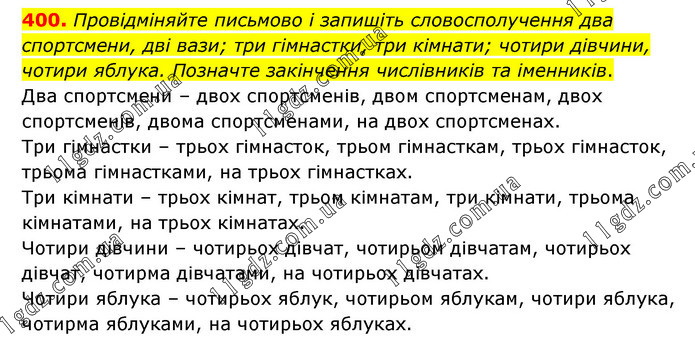 Провідміняйте письмово і запишіть словосполучення два спортсмени, дві вази; три гімнастки, три кімнати; чотири дівчини, чотири яблука. Позначте закінчення числівників та іменників. Два спортсмени – двох спортсменів, двом спортсменам, двох спортсменів, двома спортсменами, на двох спортсменах. Три гімнастки – трьох гімнасток, трьом гімнасткам, трьох гімнасток, трьома гімнастками, на трьох гімнастках. Три кімнати – трьох кімнат, трьом кімнатам, три кімнати, трьома кімнатами, на трьох кімнатах. Чотири дівчини – чотирьох дівчат, чотирьом дівчатам, чотирьох дівчат, чотирма дівчатами, на чотирьох дівчатах. Чотири яблука – чотирьох яблук, чотирьом яблукам, чотири яблука, чотирма яблуками, на чотирьох яблуках.