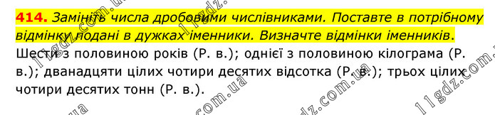 Замініть числа дробовими числівниками. Поставте в потрібному відмінку подані в дужках іменники. Визначте відмінки іменників. Шести з половиною років (Р. в.); однієї з половиною кілограма (Р. в.); дванадцяти цілих чотири десятих відсотка (Р. в.); трьох цілих чотири десятих тонн (Р. в.).