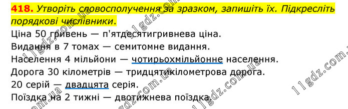Утворіть словосполучення за зразком, запишіть їх. Підкресліть порядкові числівники. Ціна 50 гривень — п'ятдесятигривнева ціна. Видання в 7 томах — семитомне видання. Населення 4 мільйони — чотирьохмільйонне населення. Дорога 30 кілометрів — тридцятикілометрова дорога. 20 серій — двадцята серія. Поїздка на 2 тижні — двотижнева поїздка.