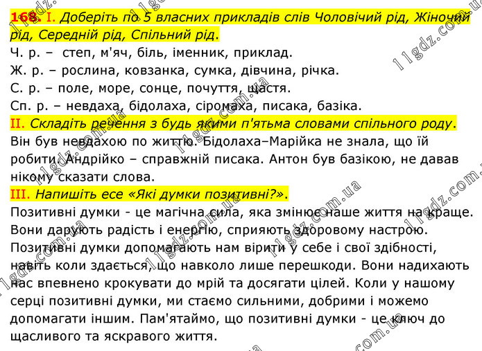 І. Доберіть по 5 власних прикладів слів Чоловічий рід, Жіночий рід, Середній рід, Спільний рід. Ч. р. – степ, м'яч, біль, іменник, приклад. Ж. р. – рослина, ковзанка, сумка, дівчина, річка. С. р. – поле, море, сонце, почуття, щастя. Сп. р. – невдаха, бідолаха, сіромаха, писака, базіка. ІІ. Складіть речення з будь якими п'ятьма словами спільного роду. Він був невдахою по життю. Бідолаха–Марійка не знала, що їй робити. Андрійко – справжній писака. Антон був базікою, не давав нікому сказати слова. ІІІ. Напишіть есе «Які думки позитивні?». Позитивні думки - це магічна сила, яка змінює наше життя на краще. Вони дарують радість і енергію, сприяють здоровому настрою. Позитивні думки допомагають нам вірити у себе і свої здібності, навіть коли здається, що навколо лише перешкоди. Вони надихають нас впевнено крокувати до мрій та досягати цілей. Коли у нашому серці позитивні думки, ми стаємо сильними, добрими і можемо допомагати іншим. Пам'ятаймо, що позитивні думки - це ключ до щасливого та яскравого життя.
